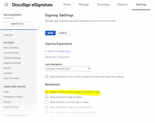 The following code snippets update the account’s settings (For the account that was used to authenticate to Docusign for the purpose of making API calls) and change it to require signers to provide a reason when they decline. Note that this code can only be run if you authenticate as a user with admin privileges.