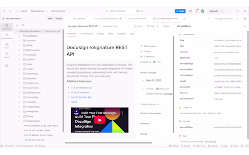 Postman is the most popular tool for testing and expermenting with Dcusign API calls. Let us make it easier for you to use it with our API collections.